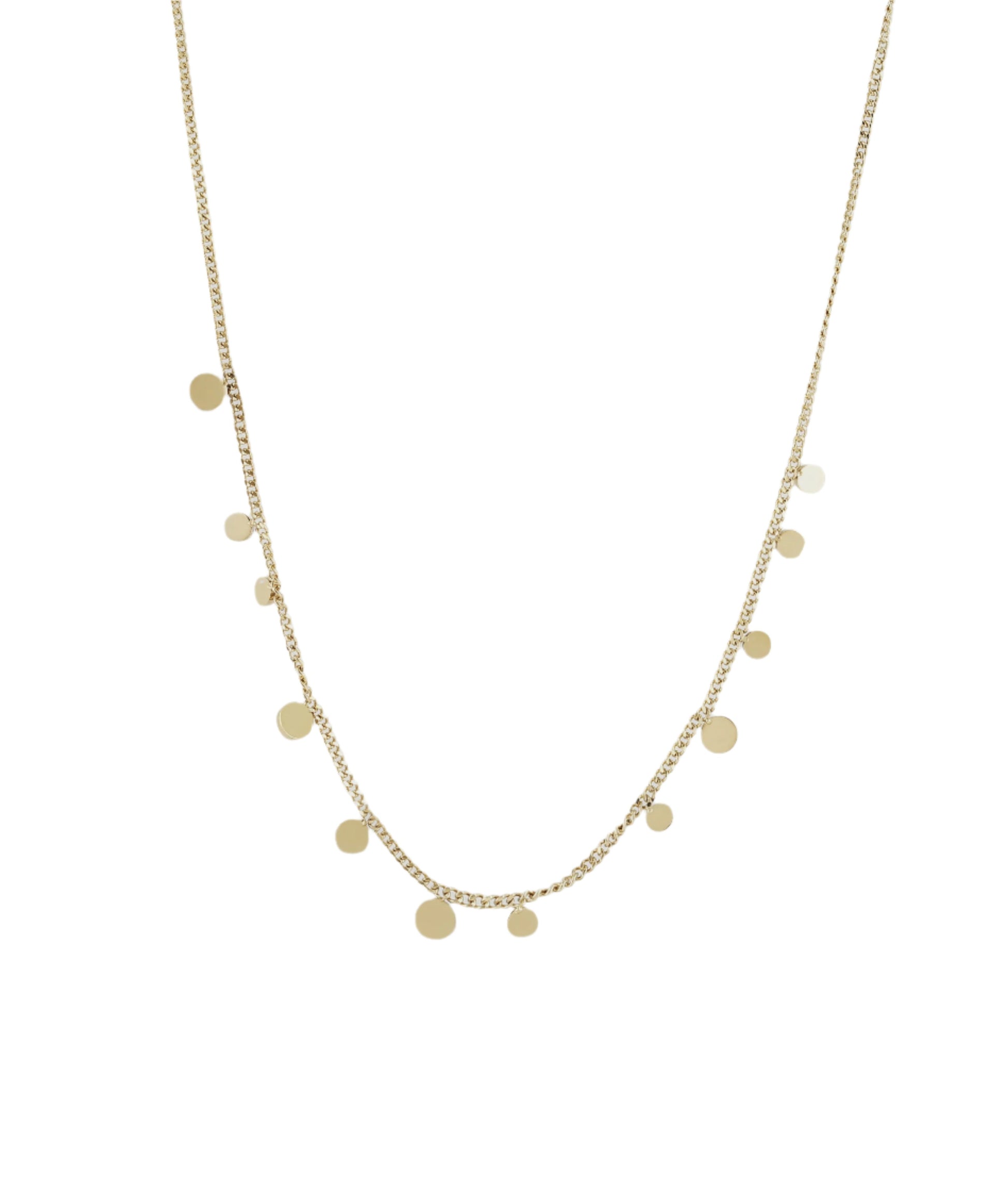 A beautiful necklace made of stainless steel and ionically coated in gold. Will complement any outfit day or night. Decorated with small gold discs.
