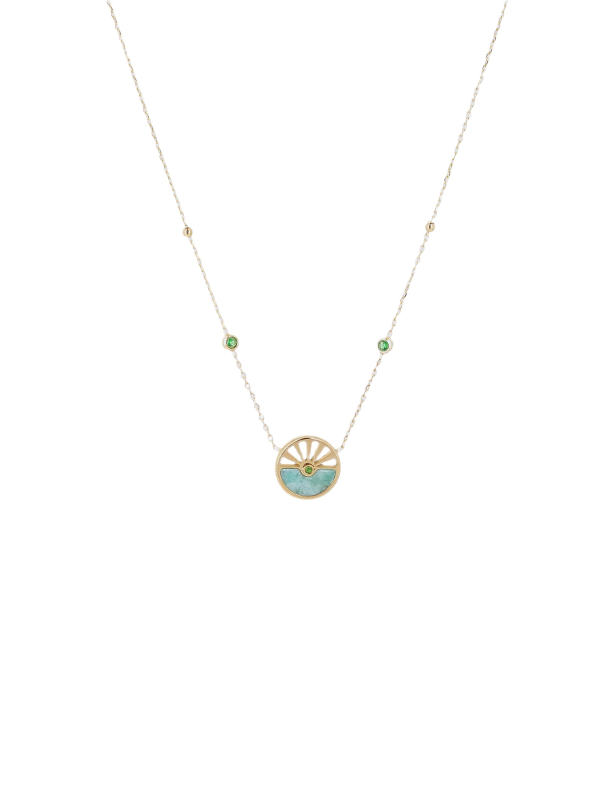 A steel necklace chain coated in gold and decorated with semi-precious stones.