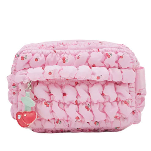 Our best selling carry-it-all pouch got a sporty makeover in our newest pink cherry printed quilted nylon scrunch with a cherry charm zipper puller! Stash this sporty staple anywhere - from home to your favorite on-the-go duffle or everyday tote!