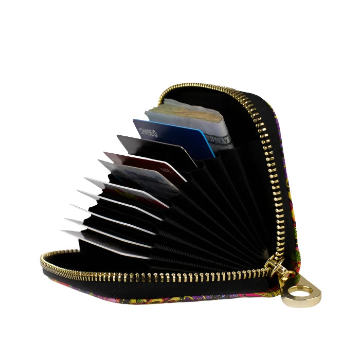 Features full grain leather texture with a fabric 11 pocket divider interior, exposed metal zipper and boasts RFID protection to protect you from identity theft. RFID blocking technology prevents unauthorized access to personal information, credit cards, debit cards, banking information, driver’s licenses, etc.